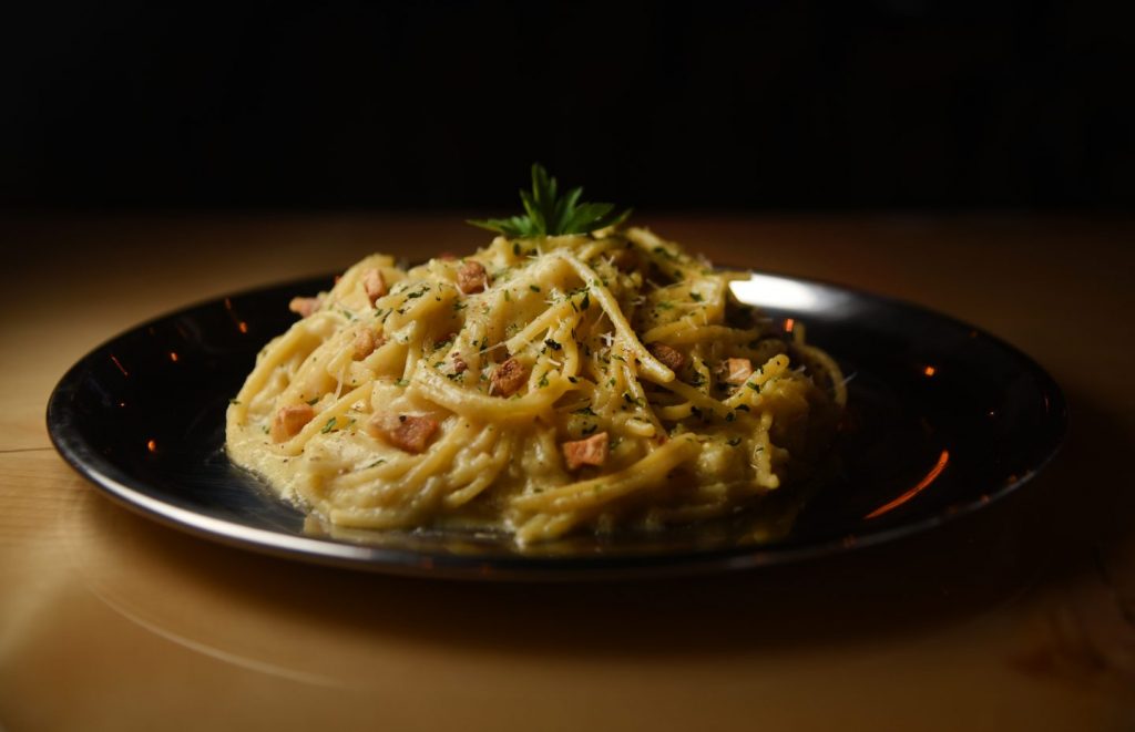 Assim que o macarrão estiver cozido, reserve 1 xícara (chá) da água do cozimento. Agora você vai precisar fazer tudo bem rapidinho: escorra a água, transfira o macarrão para a frigideira com o guanciale quente, junte os ovos e misture bem — a ideia é que o calor da massa cozinhe as gemas, formando um creme. Caso necessário, volte a frigideira ao fogo baixo e vá adicionando aos poucos a água do cozimento reservada, mexendo com uma espátula por alguns minutinhos até formar um molho espesso. Cuidado para não cozinhar as gemas!