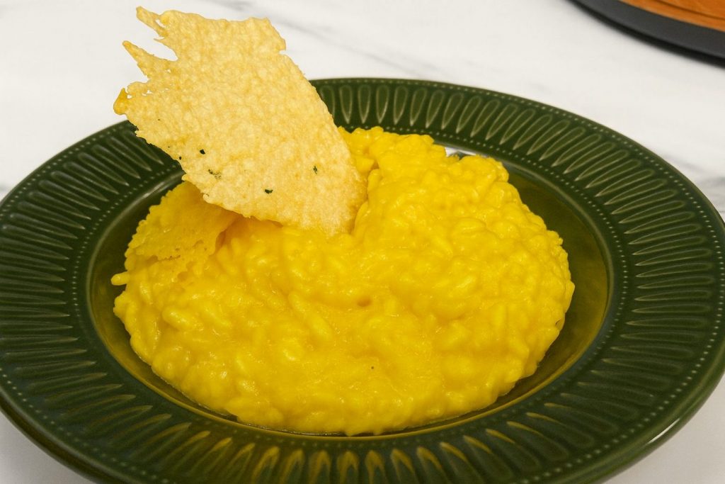 Em outra panela com manteiga, refogue a cebola e o arroz. Acrescente o vinho e deixe o álcool evaporar. Coloque aos poucos o caldo até o arroz ficar al dente. Desligue o fogo e junte a manteiga e os queijos mexendo bem para incorporar. Sirva em seguida.