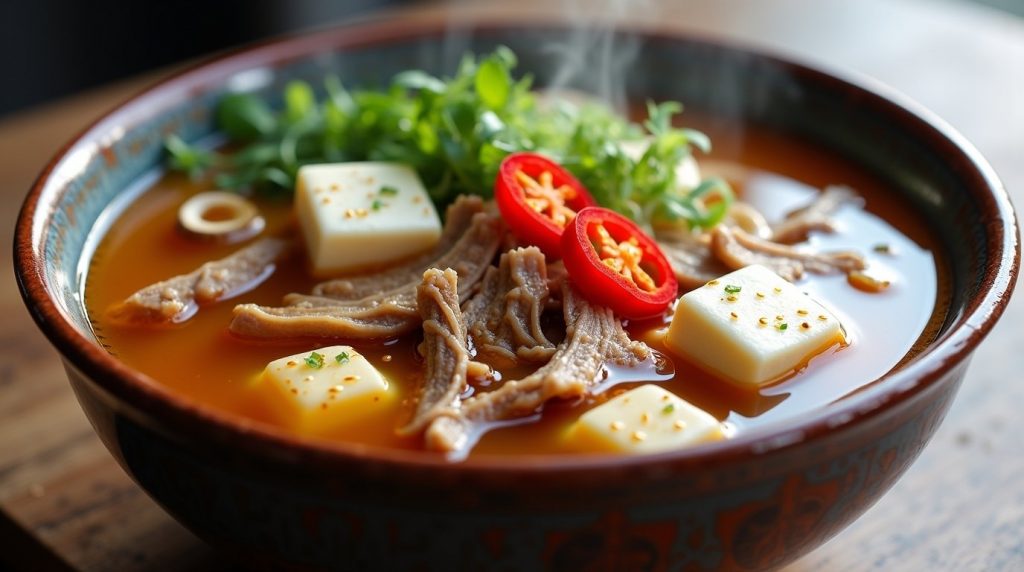 3.Depois de selar a carne, passe o caldo e o pato para uma panela mais funda e acrescente todos os ingredientes, fervendo tudo por uns 2 minutos. Tempere com shoyu, vinagre de arroz e pimenta-dedo-de-moça picada.